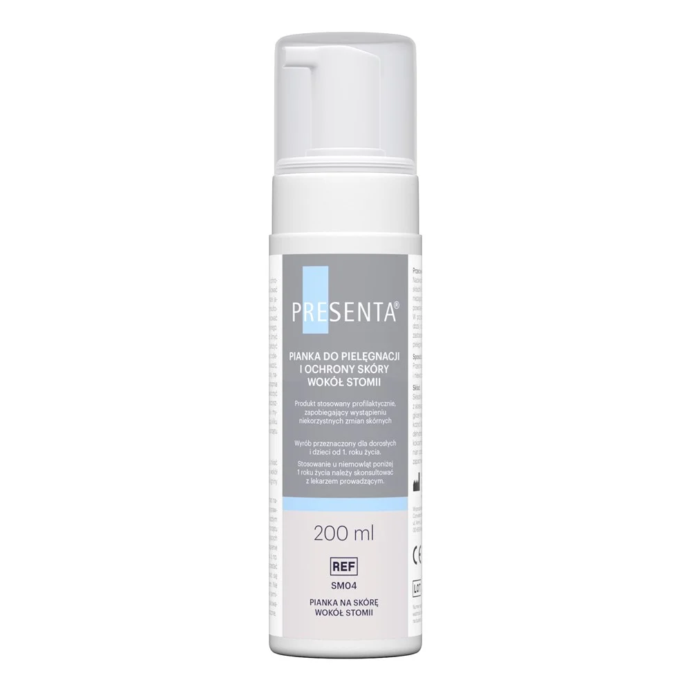 PRESENTA® pianka do pielęgnacji i ochrony skóry wokół stomii to delikatny preparat przeznaczony do codziennej higieny i zabezpieczenia wrażliwej skóry. Dzięki zawartości wyciągu z aloesu łagodzi podrażnienia i przynosi ulgę, jednocześnie pomagając utrzymać odpowiedni poziom nawilżenia. Produkt tworzy na skórze warstwę ochronną, która zabezpiecza ją przed działaniem czynników zewnętrznych. Zawarte w piance składniki myjące skutecznie, a zarazem łagodnie oczyszczają skórę wokół stomii, nie naruszając jej naturalnej bariery. Może być stosowana zamiast wody i mydła, bez konieczności spłukiwania, co czyni ją wygodnym rozwiązaniem w codziennej pielęgnacji.