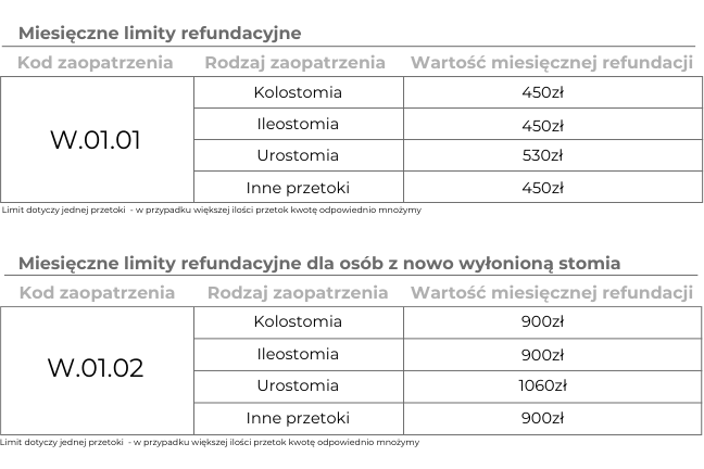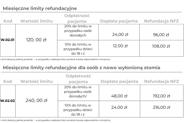 co oznacza, że Pacjenci w ramach refundacji mogą zaopatrzyć się w nie bezpłatnie do wysokości limitu, który jest zależny od rodzaju wyłonionej stomii.